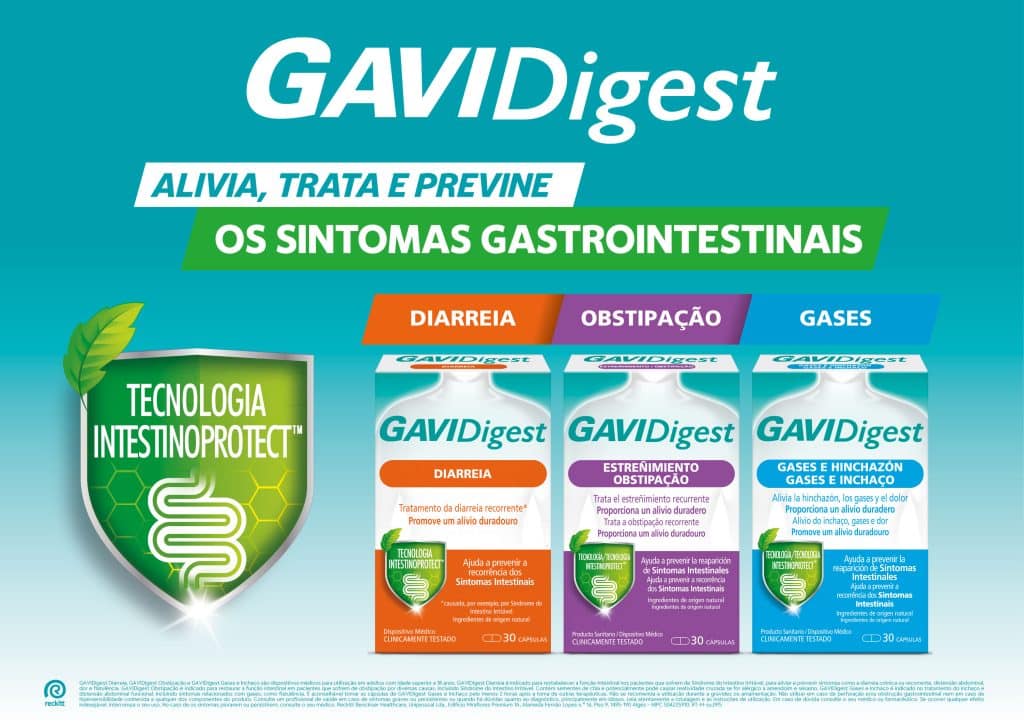 GAVIDigest Diarreia, GAVIDigest Obstipação e GAVIDigest Gases e Inchaço são dispositivos médicos para utilização em adultos com idade superior a 18 anos. GAVIDigest Diarreia é indicado para restabelecer a função intestinal nos pacientes que sofrem de Síndrome do Intestino Irritável, para aliviar e prevenir sintomas como a diarreia crónica ou recorrente, distensão abdominal, dor e flatulência. GAVIDigest Obstipação é indicado para restaurar a função intestinal em pacientes que sofrem de obstipação por diversas causas, incluindo Síndrome do Intestino Irritável. Contém sementes de chia e potencialmente pode causar reatividade cruzada se for alérgico a amendoim e sésamo. GAVIDigest Gases e Inchaço é indicado no tratamento do inchaço e distensão abdominal funcional, incluindo sintomas relacionados com gases, como flatulência. É aconselhável tomar as cápsulas de GAVIDigest Gases e Inchaço pelo menos 2 horas após a toma de outras terapêuticas. Não se recomenda a utilização durante a gravidez ou amamentação. Não utilizar em caso de perfuração e/ou obstrução gastrointestinal nem em caso de hipersensibilidade conhecida a qualquer dos componentes do produto. Consulte um profissional de saúde em caso de sintomas graves ou persistentes ou quando há dúvidas quanto ao diagnóstico, principalmente em idosos. Leia atentamente a rotulagem e as instruções de utilização. Em caso de dúvida consulte o seu médico ou farmacêutico. Se ocorrer qualquer efeito indesejável, interrompa o seu uso. No caso de os sintomas piorarem ou persistirem, consulte o seu médico. Reckitt Benckiser Healthcare , Unipessoal Lda . Edifício Miraflores Premium 1A , Alameda Fernão Lopes n .o 16 , Piso 9 , 1495-190 Algés-NIPC 504225910. RT-M-mh2uhJ