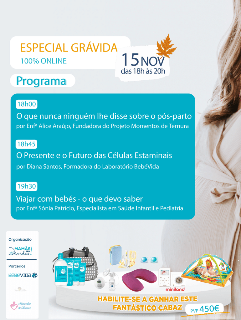 Quer descobrir o que nunca ninguém lhe disse sobre o pós-parto ou o que deve saber antes de viajar com bebés? No próximo “Especial Grávida”, que se realiza no próximo dia 15 de novembro, entre a 18h00 e as 20h00, a Academia Mamãs Sem Dúvidas vai ficar a saber tudo o que precisa. Esta é mais uma sessão 100% online e de participação gratuita.