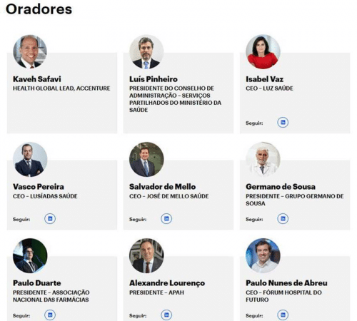 A sessão terá como keynote speaker Kaveh Safavi (responsável mundial da área de Saúde da Accenture), e com os speakers Paulo Duarte (presidente da Associação Nacional das Farmácias), Alexandre Lourenço (presidente da APAH), Paulo Nunes de Abreu (CEO do Fórum Hospital do Futuro), Rui Mesquita (professor na área da saúde na AESE Business School) e Ana Sofia Marta (vice-presidente e responsável pela área de Saúde e Administração Pública na Accenture Portugal).