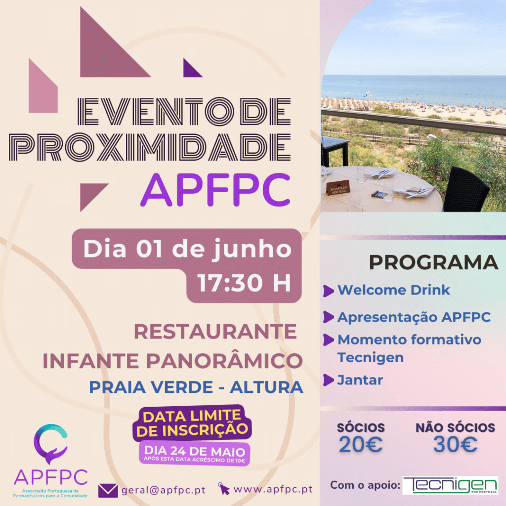 No próximo dia 1 de junho, sábado, a Associação Portuguesa de Farmacêuticos para a Comunidade (APFPC) vai organizar o seu primeiro evento presencial. O Evento de Proximidade APFPC vai decorrer no Clube Praia Verde e Restaurante Panorâmico, em Altura, no Algarve, e conta com o apoio da Tecnigen.