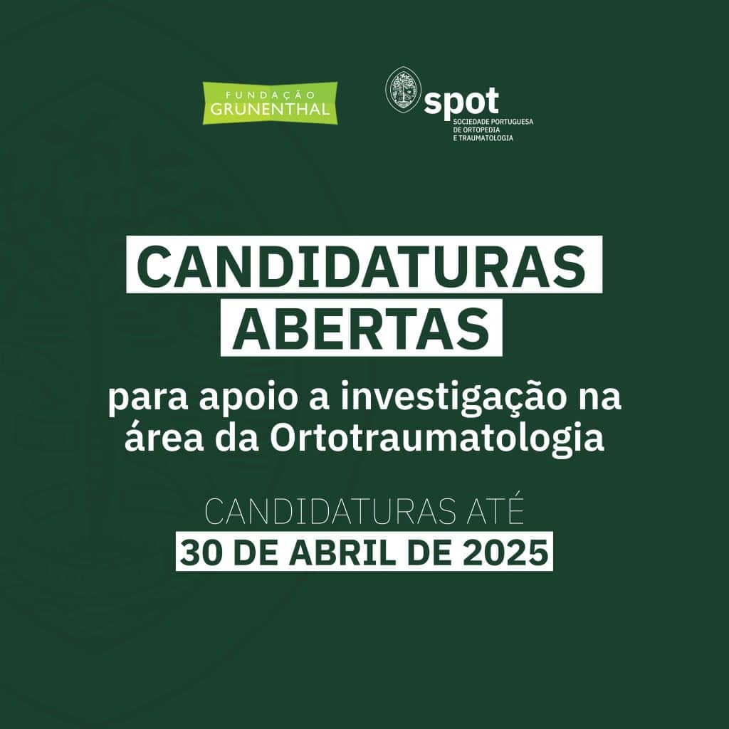 A Sociedade Portuguesa de Ortopedia e Traumatologia (SPOT), em parceria com a Fundação Grünenthal, anuncia a abertura das candidaturas para a edição anual do Prémio “Melhor Trabalho sobre gestão da dor em Ortotraumatologia”. A distinção visa incentivar a investigação da dor em Portugal, promovendo abordagens inovadoras para o tratamento em contexto ortopédico e traumatológico.
