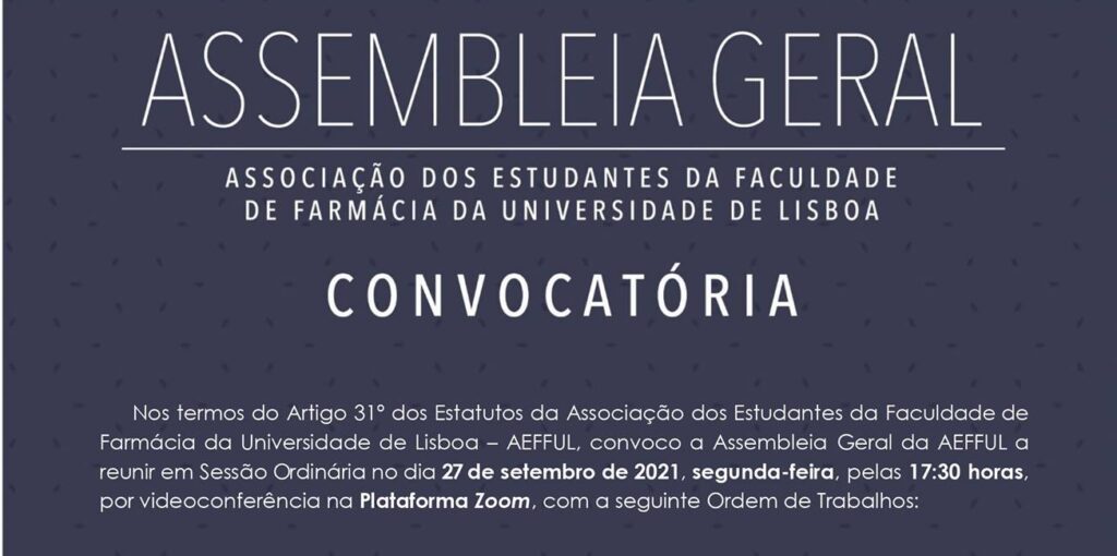 A Mesa da Assembleia Geral da Associação dos Estudantes da Faculdade de Farmácia da Universidade de Lisboa (AEFFUL), agendou uma Sessão Ordinária, para o próximo dia 27 de setembro, pelas 17:30.