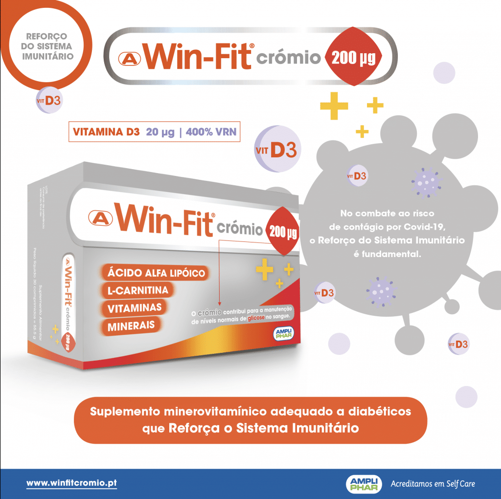 Disponibilizado no mercado farmacêutico português pela Ampliphar, o Win-Fit crómio apresenta-se como um complemento à terapêutica da diabetes e na situação pré-diabética. O Win-Fit crómio destaca-se pela sua fórmula única e inovadora – a mais completa do mercado – com 200 µg de crómio por comprimido, tendo ainda na sua composição importantes vitaminas e minerais que contribuem para o normal funcionamento do sistema imunitário: Vitamina D3, Vitamina A, Vitamina E, Vitamina C, Vitamina B1, Vitamina B2, Vitamina B6, Vitamina B12, Ácido Alfa Lipóico (ALA), L-carnitina, Niacina, Ácido Fólico, Ácido Pantoténico, Ferro, Zinco, Selénio e Cobre.