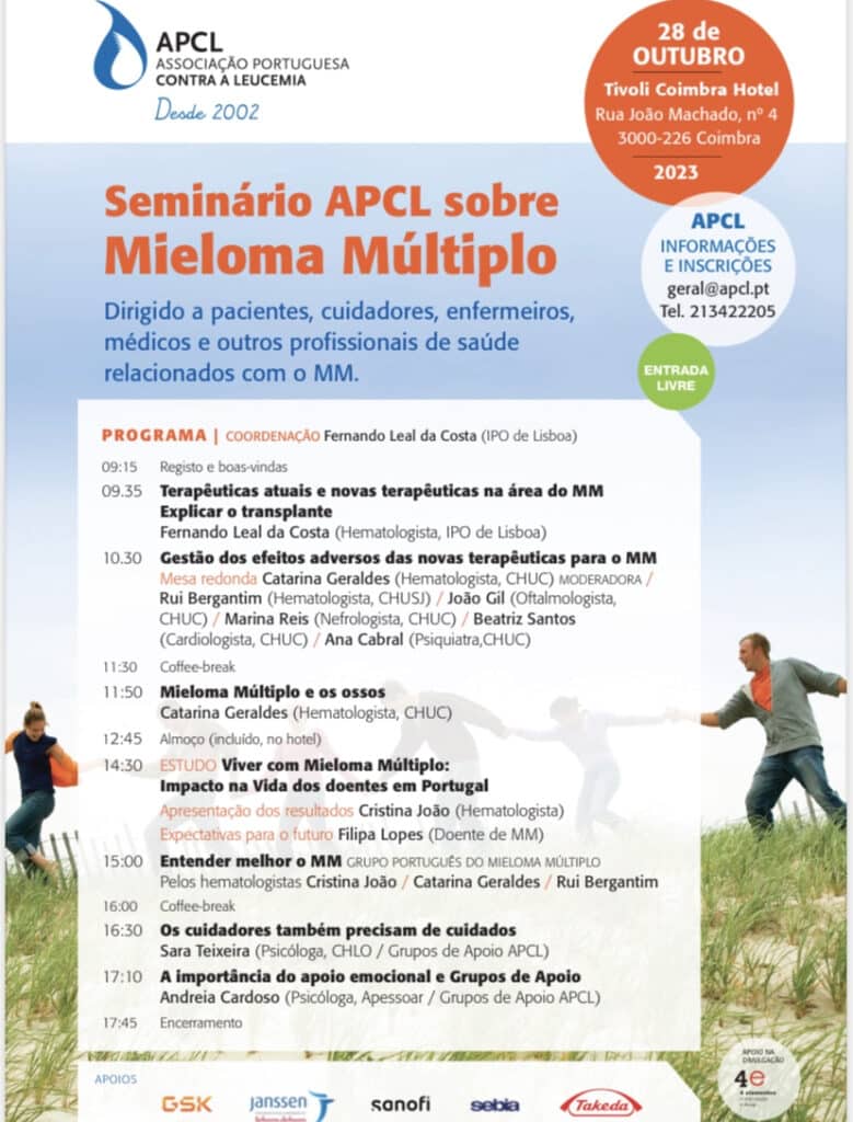 A Associação Portuguesa Contra a Leucemia (APCL) vai organizar, no dia 28 de outubro, com início às 09h15 e final previsto para as 17h45, no Tivoli Coimbra Hotel, um seminário dedicado ao mieloma múltiplo. Na sessão, dirigida a doentes, cuidadores e profissionais de saúde que lidam com o mieloma múltiplo, serão apresentados os resultados do estudo ‘Viver com o mieloma múltiplo: impacto na vida dos doentes em Portugal’.