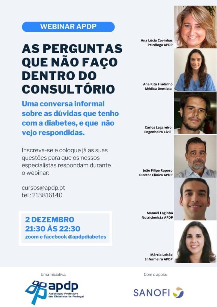 A Associação Protectora dos Diabéticos de Portugal (APDP) realiza no próximo dia 2 de dezembro, das 21h30 às 22h30, o webinar “As perguntas que não faço dentro do consultório”, através da plataforma Zoom e com transmissão em direto na sua página do Facebook (@apdpdiabetes). O objetivo é desmitificar, através de uma conversa informal e com uma abordagem multidisciplinar, as principais preocupações e necessidades de uma pessoa com diabetes.
