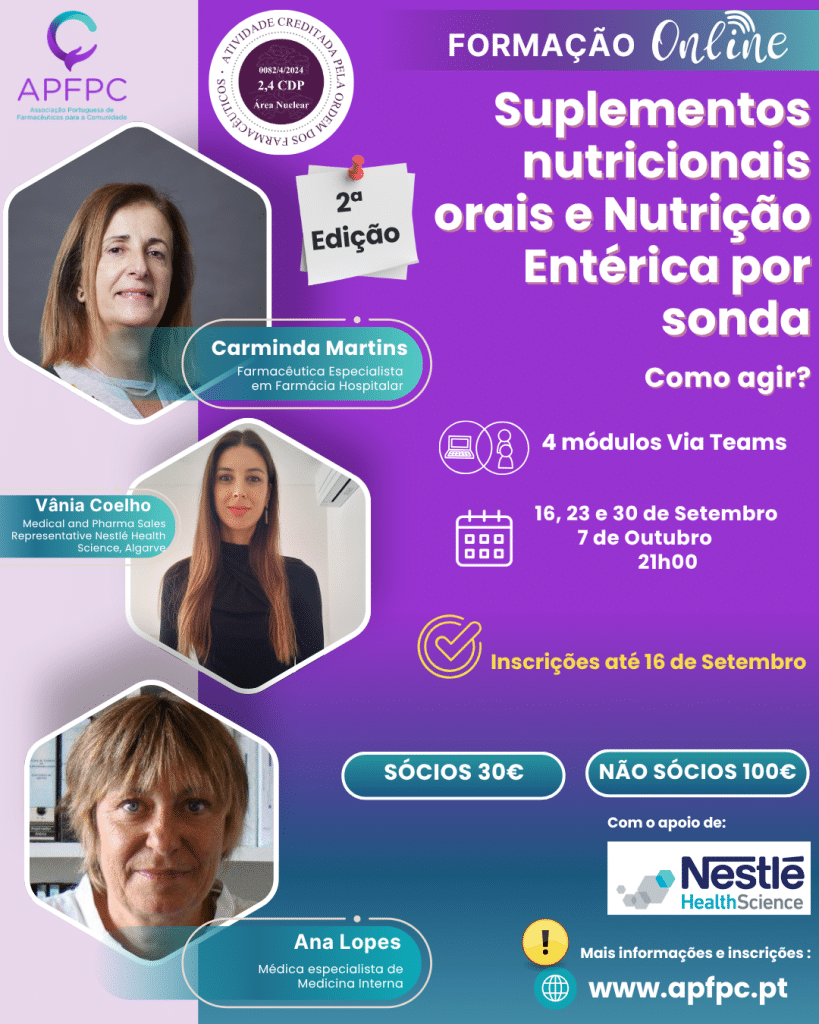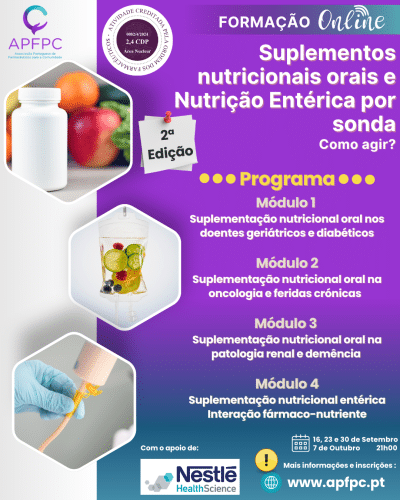 A Associação Portuguesa de Farmacêuticos para a Comunidade (APFPC) vai realizar, em setembro, a segunda edição, apoiada pela Nestlé Health Science, da formação dedicada ao tema da suplementação oral e nutrição entérica por sonda, intitulada de ‘Suplementos Nutricionais Orais e Nutrição Entérica por Sonda – Como agir?’.