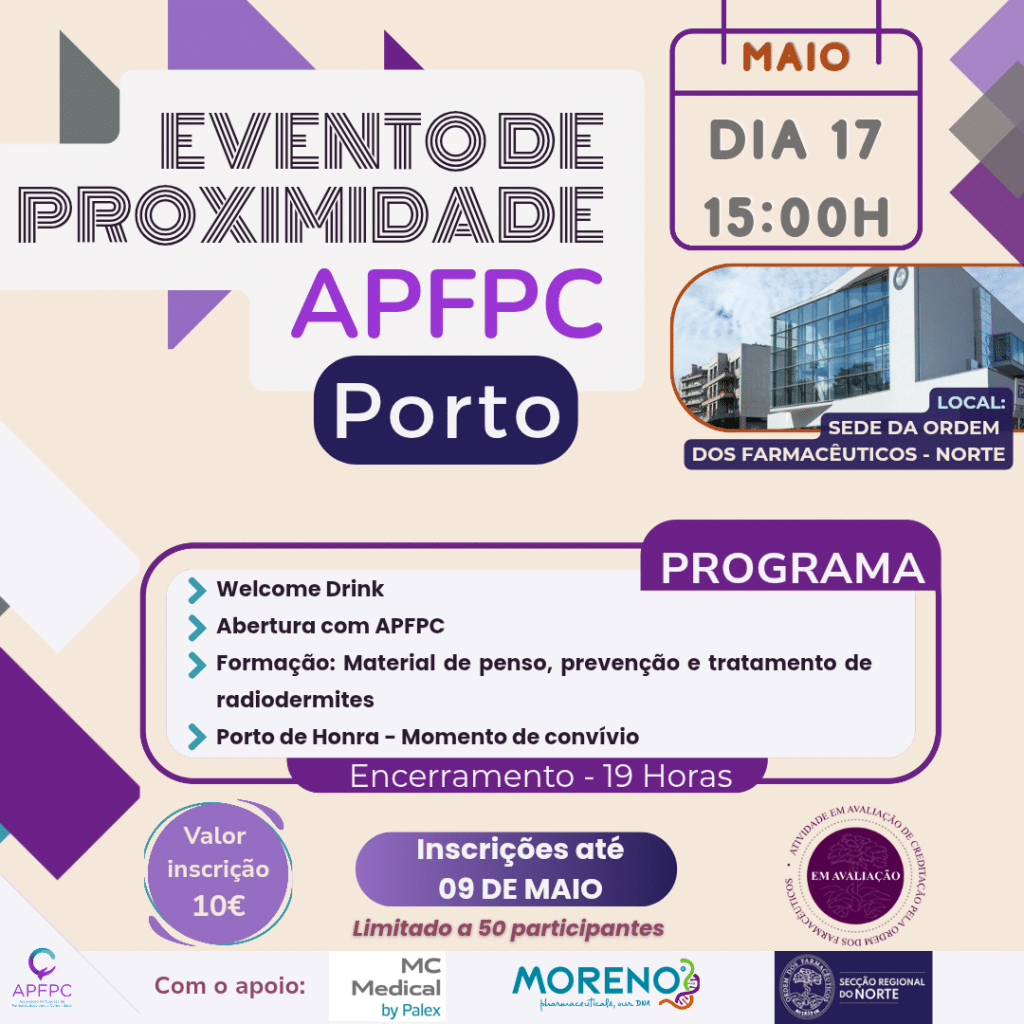 A Associação Portuguesa de Farmacêuticos para a Comunidade (APFPC) vai realizar no próximo dia 17 de maio, às 15 horas, um evento presencial no Porto, na sede da Secção Regional Norte da Ordem dos Farmacêuticos, que contará com uma formação creditada sobre ‘Material de penso, prevenção e tratamento de radiodermites’.