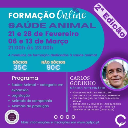 Constituída por quatro sessões, nos dias 21 e 28 de fevereiro e 06 e 13 de março, esta formação conta com o médico veterinário Carlos Godinho como responsável e acontece via online com enfoque em casos práticos.