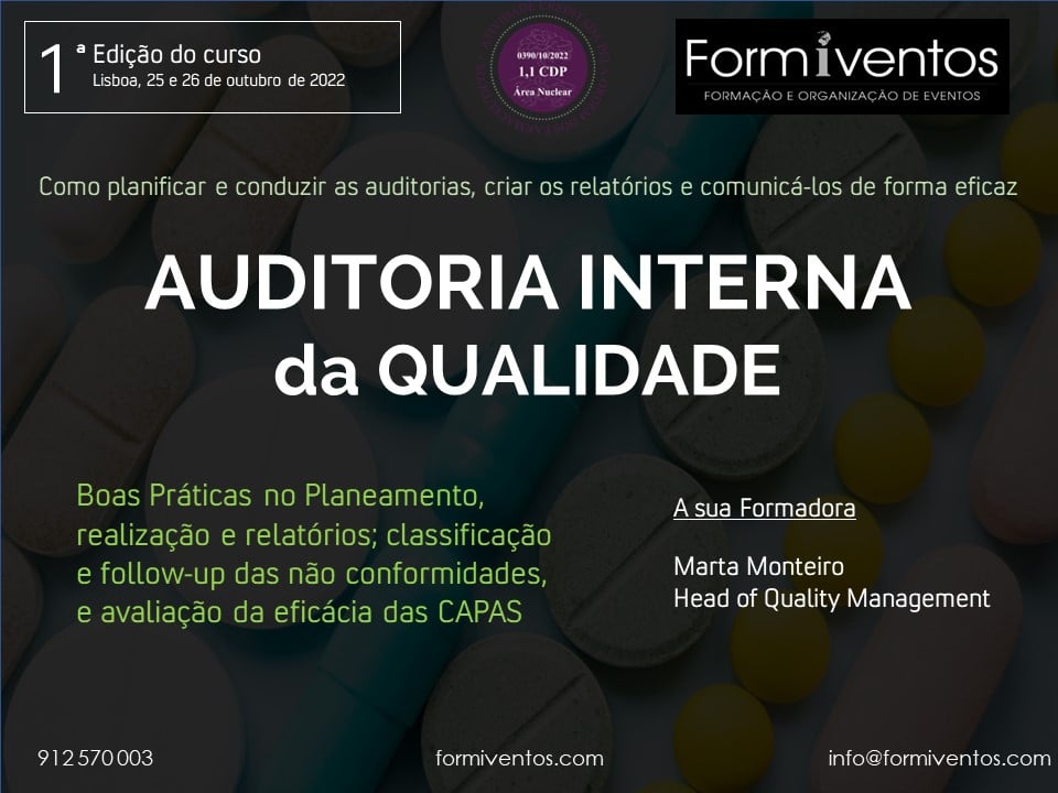 Nesta formação serão analisados em pormenor todos os aspetos críticos que devem ser abordados na condução de uma auditoria interna completa ao sistema de gestão da Qualidade; Como garantir que são efetuadas autoinspeções a intervalos regulares adequados, seguindo um programa de auditorias préviamente aprovado e que são implementadas as medidas corretivas/preventivas necessárias.