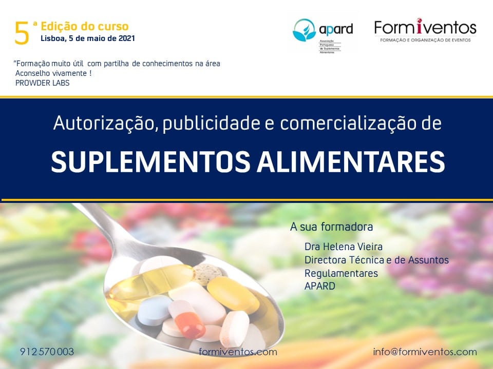No próximo dia 5 de maio terá lugar em Lisboa a 5ª edição do MASTER COURSE sobre os SUPLEMENTOS ALIMENTARES , conduzido pela reconhecida especialista Dra. Helena Vieira, Directora Técnica e de Assuntos Regulamentares da APARD .
