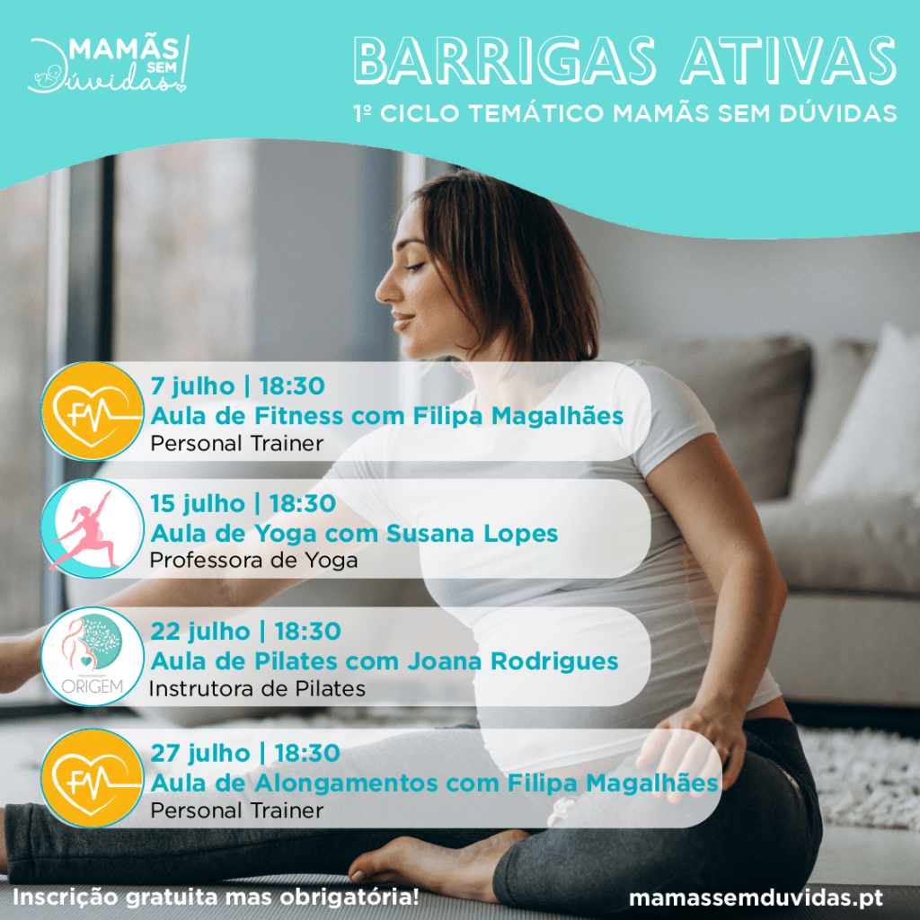 A Academia Mamãs sem Dúvidas vai realizar nos dias 7, 15, 22 e 27 de julho, às 18h30, quatro sessões online e gratuitas de “Barrigas Ativas” com o objetivo de promover a prática de exercício físico na gravidez, com modalidades indicadas e destinadas a gestantes. Com o intuito de promover um estilo de vida mais saudável, durante os nove meses de gravidez, a Mamãs sem Dúvidas vai também lançar durante o mês de julho um novo e-book intitulado “Saúde e Bem-Estar na Gravidez”.
