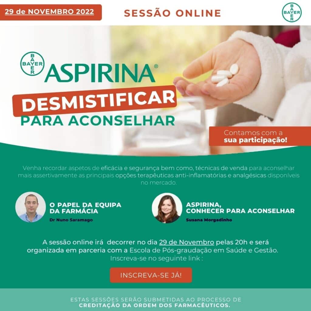 A Bayer, em parceria com a Escola de Pós-graduação em Saúde e Gestão (EPGSG), promove esta terça-feira, dia 29 de novembro, pelas 21h00, o webinar “Aspirina: desmistificar para aconselhar”. Esta sessão, em formato digital, “tem como objetivo dar a conhecer as principais opções terapêuticas anti-inflamatórias e analgésicas disponíveis no mercado farmacêutico, recordando aspetos de eficácia e segurança, bem como técnicas de venda que permitirão ao farmacêutico aconselhar estes medicamentos de forma mais assertiva”, lê-se em nota.