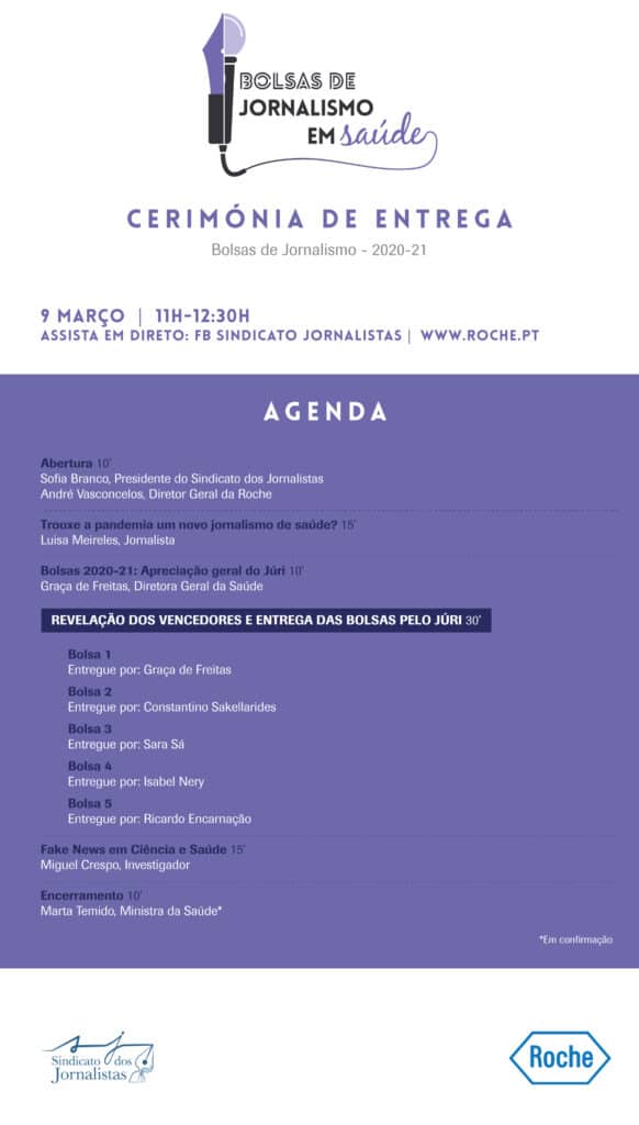 O anúncio dos jornalistas e projetos vencedores da edição de 2020 das Bolsas de Jornalismo em Saúde promovidas pelo Sindicato de Jornalistas, com o apoio da Roche, será feito no dia 9 de março pelas 11 horas, através de uma cerimónia digital que pode ser seguida na página do Facebook do Sindicato dos Jornalistas ou através do site da Roche.