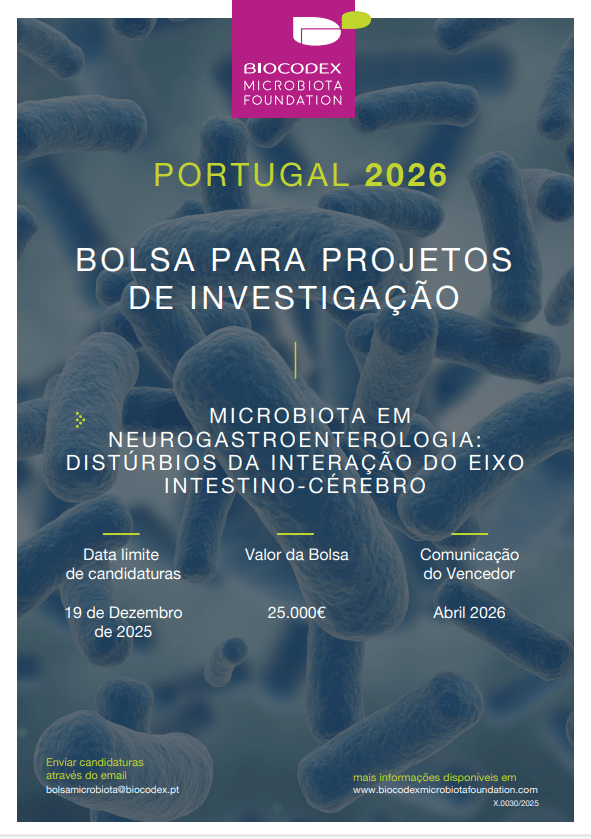 As candidaturas à Bolsa Nacional para Projetos de Investigação em Microbiota, atribuídas pela Biocodex Microbiota Foundation, no valor de 25 mil euros, estão abertas até dia 19 de dezembro. O tema escolhido para a sétima edição é a ‘Microbiota em Neurogastroenterologia: Distúrbios da interação do eixo intestino-cérebro’.