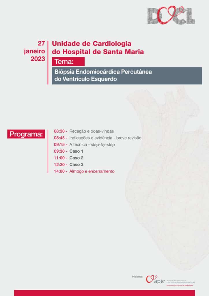 Carlos Braga, cardiologista de intervenção e responsável pela iniciativa D@CL, da APIC, explica: “Com este D@CL pretende-se chamar a atenção para a atualidade e a complexidade técnica dos casos que requerem biópsia endomiocárdica percutânea e promover a atividade formativa para os cardiologistas de intervenção com interesse na área”.