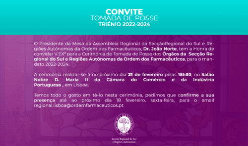 A Cerimónia de Tomada de Posse dos Órgãos da Secção Regional do Sul e Regiões Autónomas (SRSRA) da Ordem dos Farmacêuticos (OF) para o Triénio 2022-2024, vai realizar-se no próximo dia 21 de fevereiro, pelas 18:30, no Salão Nobre D. Maria II da Câmara de Comércio e da Indústria Portuguesa, em Lisboa.