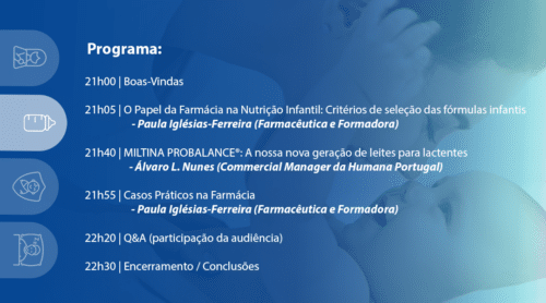Agora, na segunda sessão será abordado o tema: “Nutrição Infantil: O essencial sobre as fórmulas infantis”, explorando o importante papel da farmácia e do farmacêutico na seleção e adequado aconselhamento aos seus utentes sobre estas fórmulas.