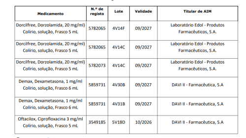 Na sequência de ter sido detetado o risco de contaminação microbiana em lotes dos medicamentos Dorcilfree®, Demax® e Oftacilox® Colírios Multidose, decorrente de inspeção realizada pela agência francesa (ANSM) ao fabricante dos mesmos, como medida de precaução, o Infarmed ordenou a recolha imediata dos lotes em questão