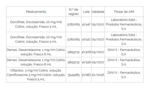 A Autoridade Nacional do Medicamento e Produtos de Saúde (Infarmed) alerta, no seu portal, ter sido detetado risco de contaminação microbiana em lotes dos medicamentos Dorcilfree®, Demax® e Oftacilox® Colírios Multidose decorrente de inspeção realizada pela Agência Francesa (ANSM na sigla em inglês) ao fabricante dos mesmos.