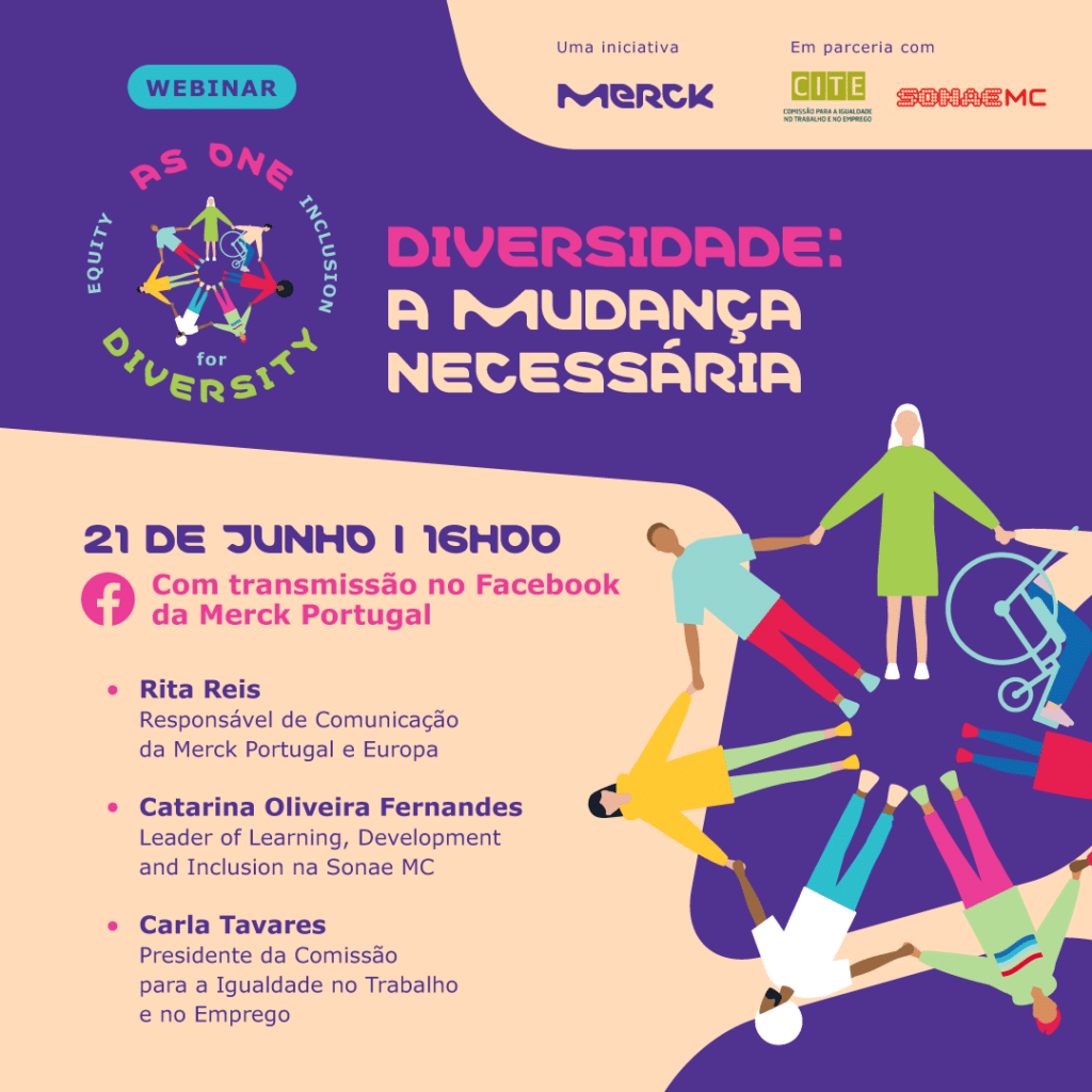 ‘Diversidade: a mudança necessária’ é o nome dado a este encontro virtual que, no próximo dia 21, a partir das 16h00, na página de Facebook da Merck Portugal, vai colocar muitas questões e procurar dar-lhes resposta. Qual o papel das instituições (públicas e privadas) no âmbito da diversidade? Que oportunidades podem a diversidade e inclusão criar? Que iniciativas podem ser implementadas de forma a criar uma cultura de diversidade e inclusão? Que exemplos práticos temos da Merck e da Sonae? Qual o caminho que ainda falta percorrer?