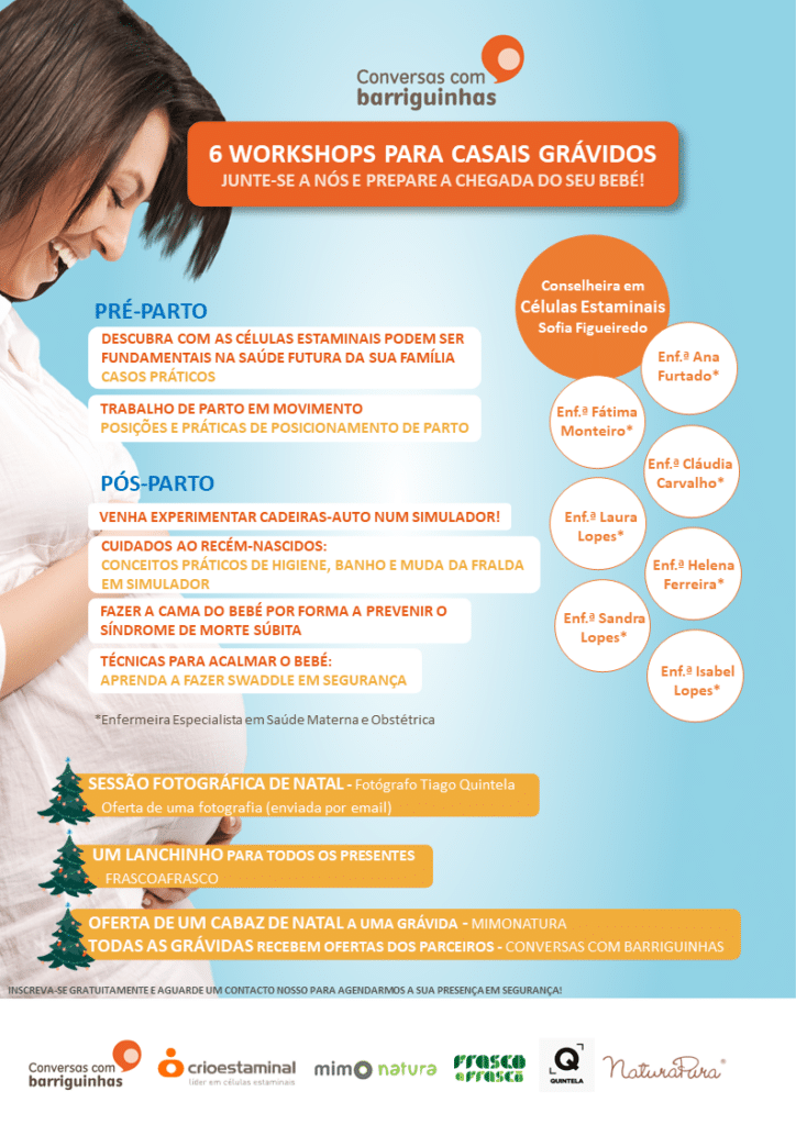 São, no total, seis workshops com componentes teóricas e práticas para um pré e pós-parto tranquilo, lecionados pelas enfermeiras especialistas em saúde materna e obstétrica Ana Furtado, Cláudia Carvalho, Fátima Monteiro, Helena Ferreira, Isabel Lopes, Laura Lopes e Sandra Lopes, e ainda a conselheira em células estaminais Sofia Figueiredo.