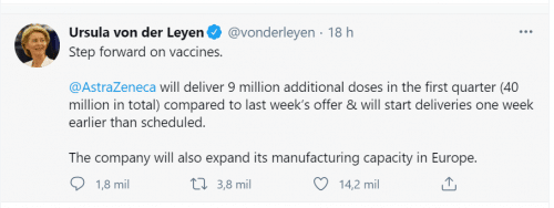 A presidente da Comissão Europeia, Ursula von der Leyen anunciou que a AstraZeneca vai fornecer à UE mais nove milhões de doses adicionais da sua vacina contra a covid-19, num total de 40 milhões de doses, um aumento de 30%.