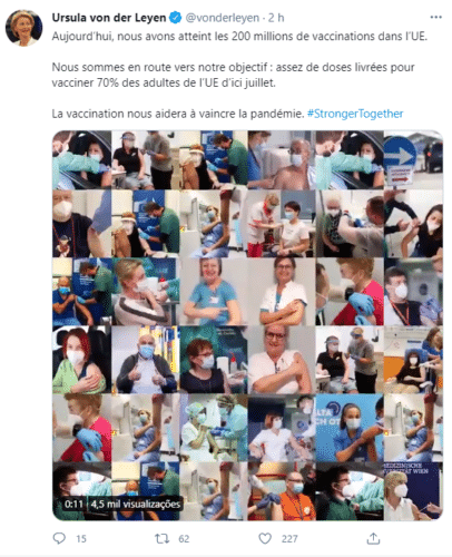 A presidente da Comissão Europeia, Ursula von der Leyen, anunciou na sua conta na rede social Twitter, que a União Europeia (UE) ultrapassou a meta de 200 milhões de vacinas administradas.