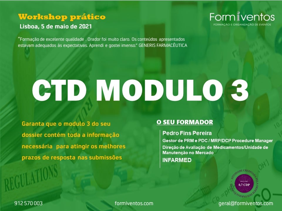 O próximo dia 5 de maio de 2020, terá lugar a formação sobre CTD MODULO 3, bajo o lema : Garanta que o modulo 3 do seu dossier contém toda a informação necessária para atingir os melhores prazos de resposta nas submissões