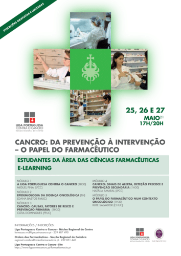 A iniciativa denominada por “Cancro: Da Prevenção à Intervenção- O Papel do Farmacêutico”, decorre no formato E-Learning, nos dias 25, 26 e 27 de maio de 2021, entre as 17:00 e as 20:00.