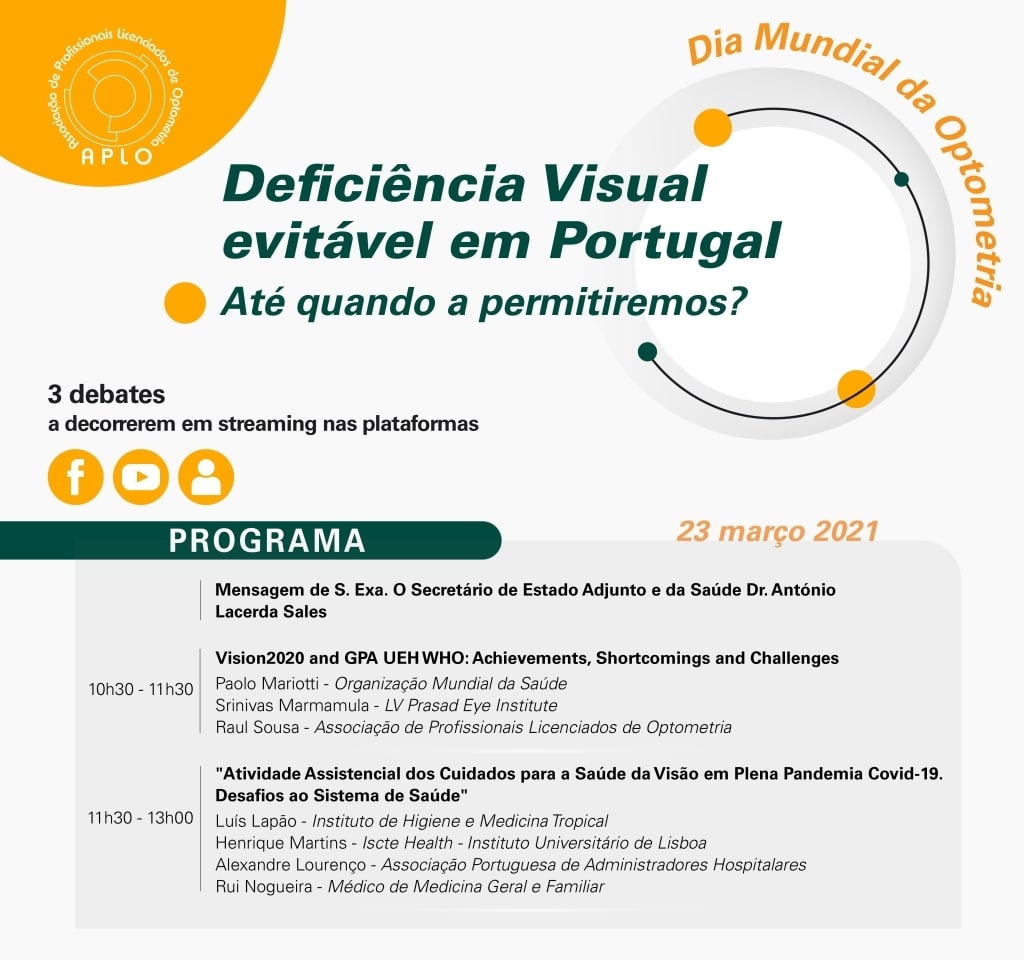 A Associação de Profissionais Licenciados de Optometria (APLO) promove uma série de debates online subordinados ao tema “Deficiência Visual evitável em Portugal. Até quando a permitiremos?”. As sessões realizam-se a 23 de março, Dia Mundial da Optometria, entre as 10h30 e as 16h30, com transmissão pública no Facebook e Youtube da APLO. O objetivo é alertar para as causas de deficiência visual e cegueira, que poderiam ser evitadas, caso fossem tratadas atempadamente.