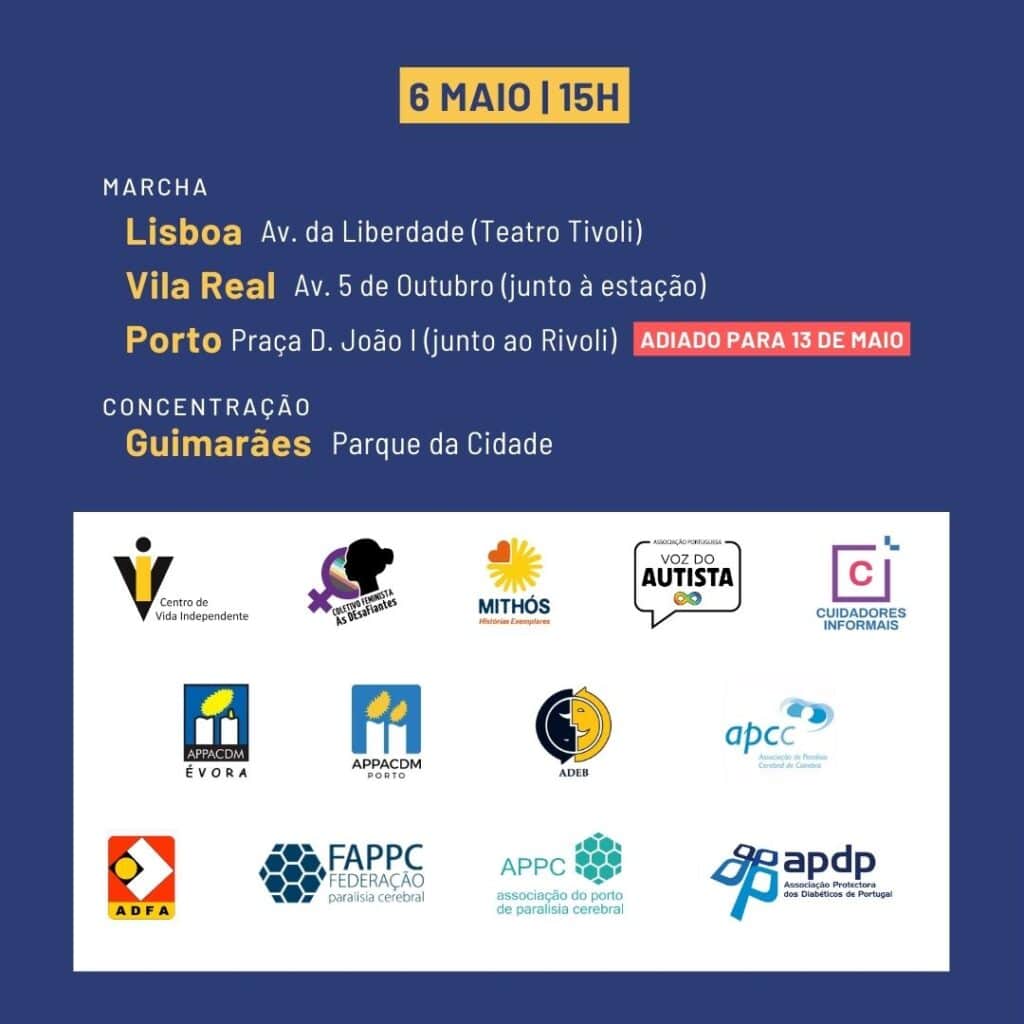 A propósito do Dia Europeu da Vida Independente, celebrado a 5 de maio, o Centro de Vida Independente realiza este sábado, dia 6 de maio, pelas 15 horas, marchas em Lisboa e Vila Real e uma concentração em Guimarães. No Porto, a marcha realiza-se no dia 13 de maio. A iniciativa conta com o apoio da Associação Protectora dos Diabéticos de Portugal (APDP).