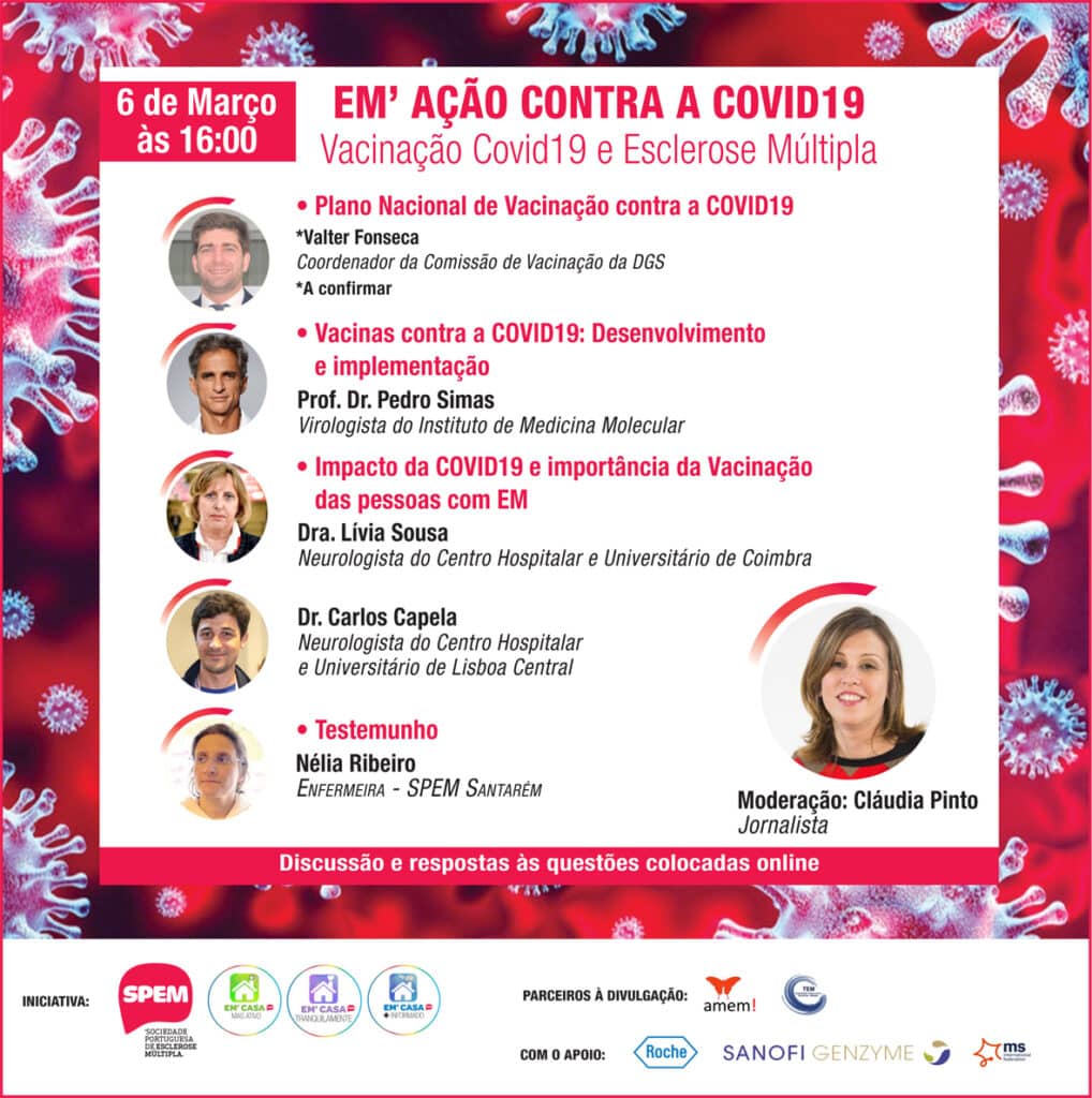 A Sociedade Portuguesa de Esclerose Múltipla em conjunto com a Sanofi e com a Roche, convidam todos os interessados a juntarem-se ao webinar EM’Ação contra a COVID-19, no dia 6 de março pelas 16h00, transmitido em direto no Facebook da SPEM. Este evento tem como principal objetivo manter a comunidade portuguesa de Esclerose Múltipla (EM), mais informada e responder às dúvidas no que diz respeito à vacinação da COVID-19, tendo em conta a medicação e terapêuticas associadas a cada doente.