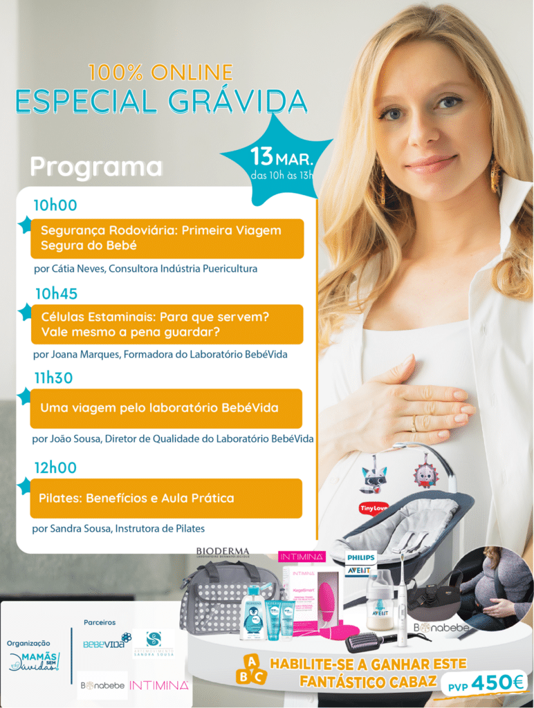 No próximo dia 13 de Março, a Academia Mamãs sem Dúvidas realiza a 3ª edição do “Especial Grávida”, um evento gratuito 100% online dedicado a todas as futuras mamãs. Em parceria com o banco de tecidos e células estaminais BebéVida, a ação conta com vários especialistas para abordar temas como a primeira viagem do bebé em segurança, a importância das células estaminais e os benefícios da prática de pilates.