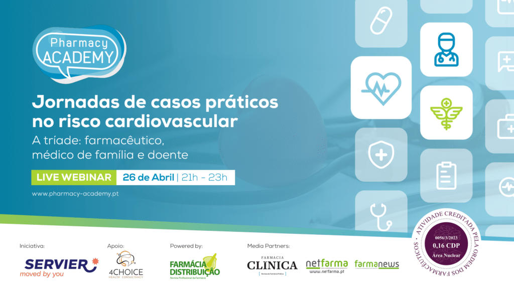 O live webinar da SERVIER PHARMACY ACADEMY, powered by FARMÁCIA DISTRIBUIÇÃO, com o apoio da 4 Choice – Health Consultancy, realiza-se no dia 26 de abril, pelas 21h e tem como tema “Jornadas de casos práticos no risco cardiovascular – A tríade: farmacêutico, médico de família e doente”.