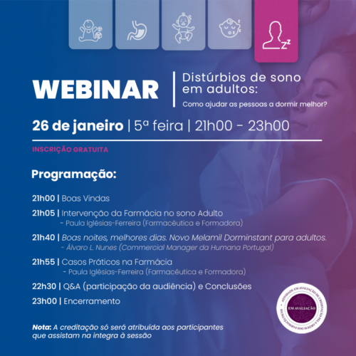 O último webinar do II Ciclo de Formação Humana, powered by FARMÁCIA DISTRIBUIÇÃO, com o apoio da marca Melamil Dorminstant, realiza-se no dia 26 de janeiro, pelas 21h, e tem como tema “Distúrbios de sono em adultos: Como ajudar as pessoas a dormir melhor?”.