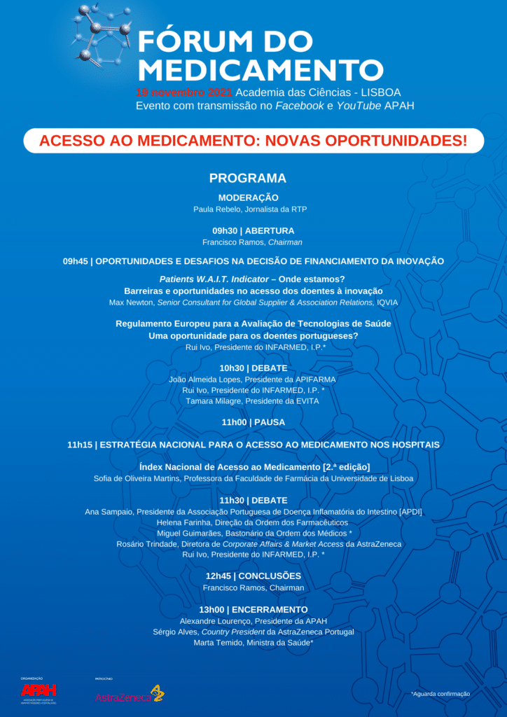 O acesso à inovação terapêutica enfrenta desafios que condicionam a capacidade da mesma servir o seu objetivo fundamental, chegar aos doentes, melhorando a sua sobrevivência e/ou qualidade de vida. Neste âmbito, torna-se relevante perceber que fatores condicionam este acesso e que oportunidades de melhoria existem que o tornem mais célere. É essa discussão que se pretende fomentar a partir da apresentação dos resultados do WAIT Indicator 2020 e da discussão sobre o papel que o “Regulamento Europeu para a Avaliação de Tecnologias de Saúde” pode ter como facilitador desse acesso, na 13ª edição do Fórum do Medicamento, uma iniciativa que terá lugar no dia 19 de novembro, na Academia das Ciências, em Lisboa. Sob o tema “Acesso ao Medicamento: Novas Oportunidades”, a Associação Portuguesa de Administradores Hospitalares (APAH) em parceria com a AstraZeneca, convidam a que se faça uma reflexão sobre os modelos de acesso aos medicamentos hospitalares a nível nacional e europeu.