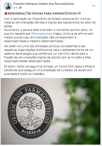 De acordo com a nota divulgada, Franklim Marques indica que pretende o estabelecimento de um caderno de encargos que contemple a fixação de remunerações dignas para os farmacêuticos.