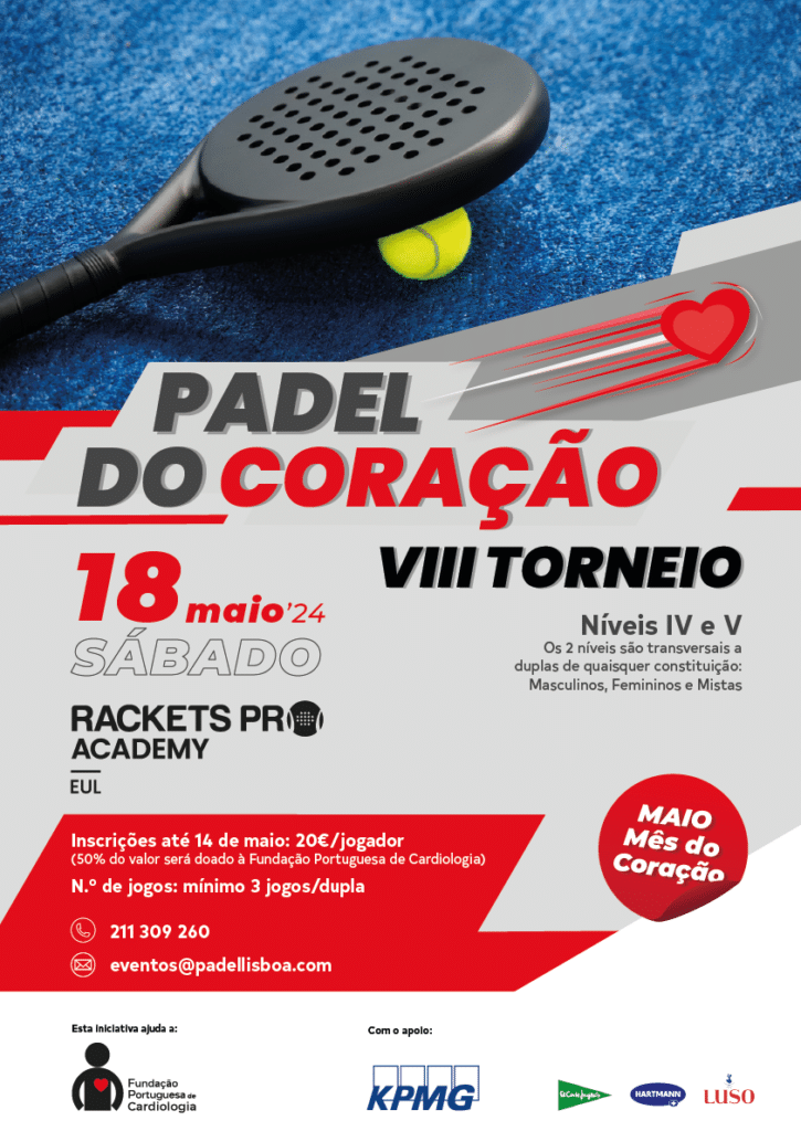 A Fundação Portuguesa de Cardiologia (FPC) vai organizar o VIII Torneio de Padel, no dia 18 de maio, no Rackets Pro EUL, em Lisboa. A iniciativa, integrada nas comemorações do “Mês do Coração”, tem como objetivo promover a saúde cardiovascular através da prática de atividade física, e angariar fundos para apoiar as atividades da Fundação Portuguesa de Cardiologia junto da população.