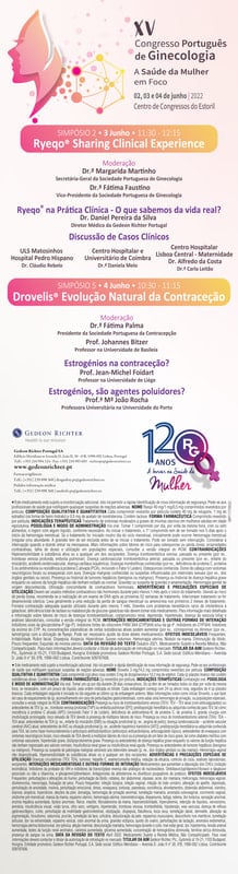 O segundo simpósio designado por Drovelis® Evolução Natural da Contraceção, marcado para o dia 4 de junho, das 10:30 às 11:15, terá a moderação de Fátima Palma, Presidente da Sociedade Portuguesa da Contracepção e por Johannes Bitzer, Professor na Universidade de Basileia. Neste simpósio falar-se-á sobre “Estrogénios na contraceção?”, com o contributo de Jean-Michel Foidart, Professor na Universidade de Liége, e sobre “Estrogénios, são agentes poluidores?”, com o testemunho de Mª João Rocha, Professora Universitária na Universidade do Porto.