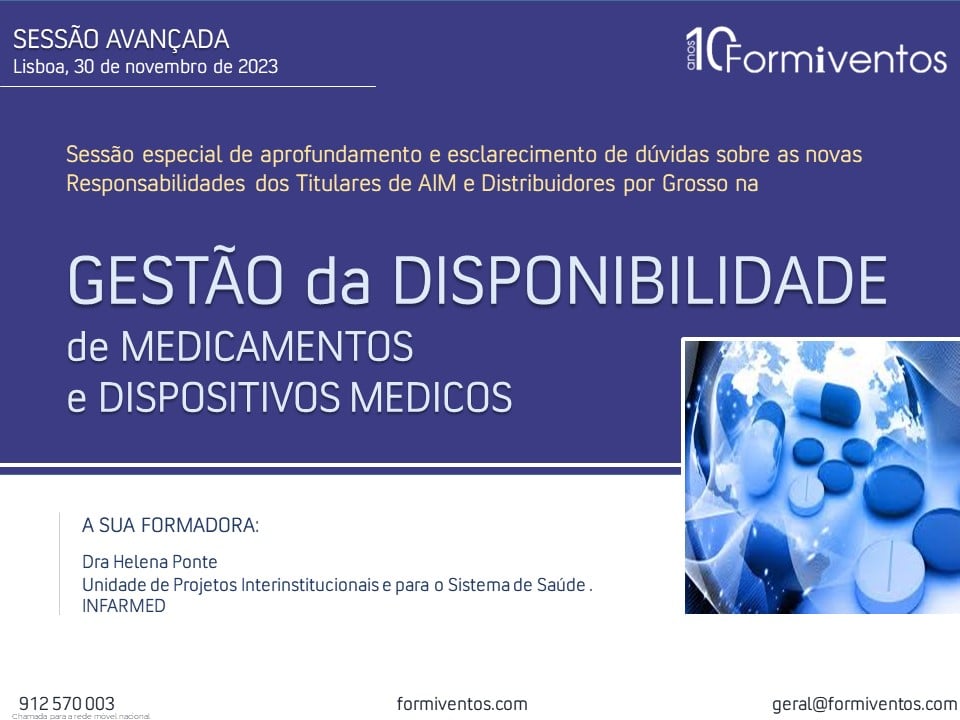No próximo dia 30 de novembro decorrerá a Sessão especial de aprofundamento e esclarecimento de dúvidas sobre as novas Responsabilidades dos Titulares de AIM e Distribuidores por Grosso na GESTÃO da DISPONIBILIDADE de MEDICAMENTOS e DISPOSITIVOS MEDICOS.