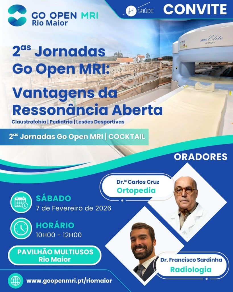 A Go Open MRI Rio Maior em parceria com a XISMOR – Grupo H Saúde promovem, no dia 7 de fevereiro de 2026, as 2.ªs Jornadas Go Open MRI: “Vantagens da Ressonância Aberta”, um encontro científico dedicado à partilha de conhecimento sobre os benefícios da ressonância magnética aberta em diferentes contextos clínicos, nomeadamente claustrofobia, pediatria e lesões desportivas.