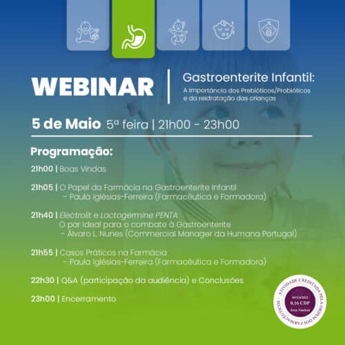 Nesta sessão será abordado o tema: “Gastroenterite Infantil: A Importância dos Prebióticos/Probióticos e da reidratação das crianças”, explorando o papel do farmacêutico no aconselhamento e acompanhamento de casos de gastroenterite e desidratação infantil.