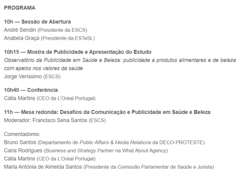 Esta mostra vai contar com uma “Mostra de Publicidade e Apresentação do Estudo”, uma conferência e uma Mesa redonda dedicada aos “Desafios da Comunicação e Publicidade em Saúde e Beleza”.