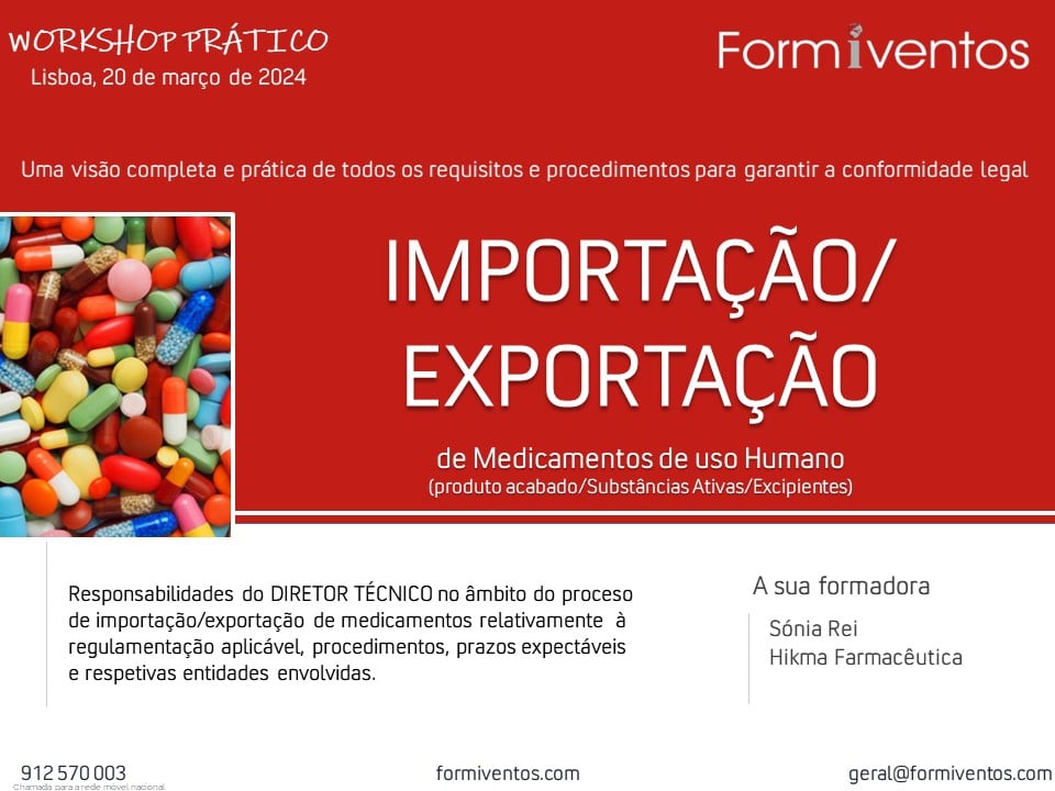Nos dias 19 e 20 de março de 2024 decorrerá em Lisboa a formação exclusiva sobre as Responsabilidades do DIRETOR TÉCNICO no âmbito do proceso de importação/exportação de medicamentos relativamente à regulamentação aplicável, procedimentos, prazos expectáveis e respetivas entidades envolvidas
