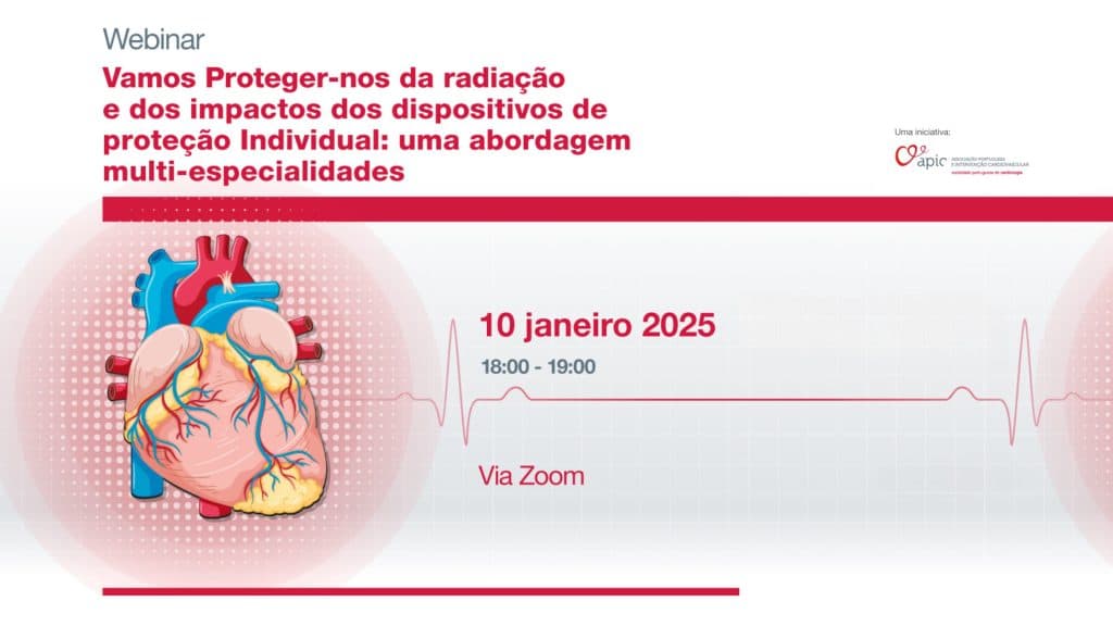 A Associação Portuguesa de Intervenção Cardiovascular (APIC) vai realizar um webinar sob o tema “Vamos proteger-nos da radiação e dos impactos dos dispositivos de proteção individual: uma abordagem multi-especialidades”, no próximo dia 10 de janeiro, das 18h00 às 19h00. A iniciativa é dirigida a profissionais de saúde e tem como objetivo consciencializar para a adoção de práticas seguras na utilização de radiação ionizante, promovendo a segurança no ambiente de trabalho.