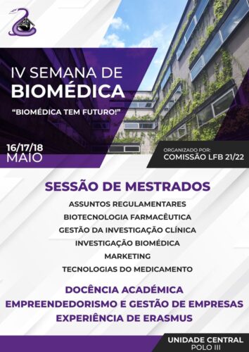 A Comissão de Curso de Farmácia Biomédica da Universidade de Coimbra (UC), está a promover, nos doias 16, 17 e 18 de maio, a IV Semana de Farmácia Biomédica, sob o tema “Biomédica tem futuro”.