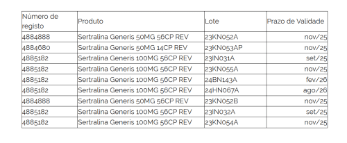A Generis Farmacêutica, S.A. vai recolher voluntariamente vários lotes do medicamentos Sertralina Generis 50 mg e 100 mg, Comprimidos revestidos por película, por ter sido detetada uma impureza acima do limite aceitável, informou, no seu portal, a Autoridade Nacional do Medicamento e Produtos de Saúde (Infarmed), na passada quinta-feira (28).