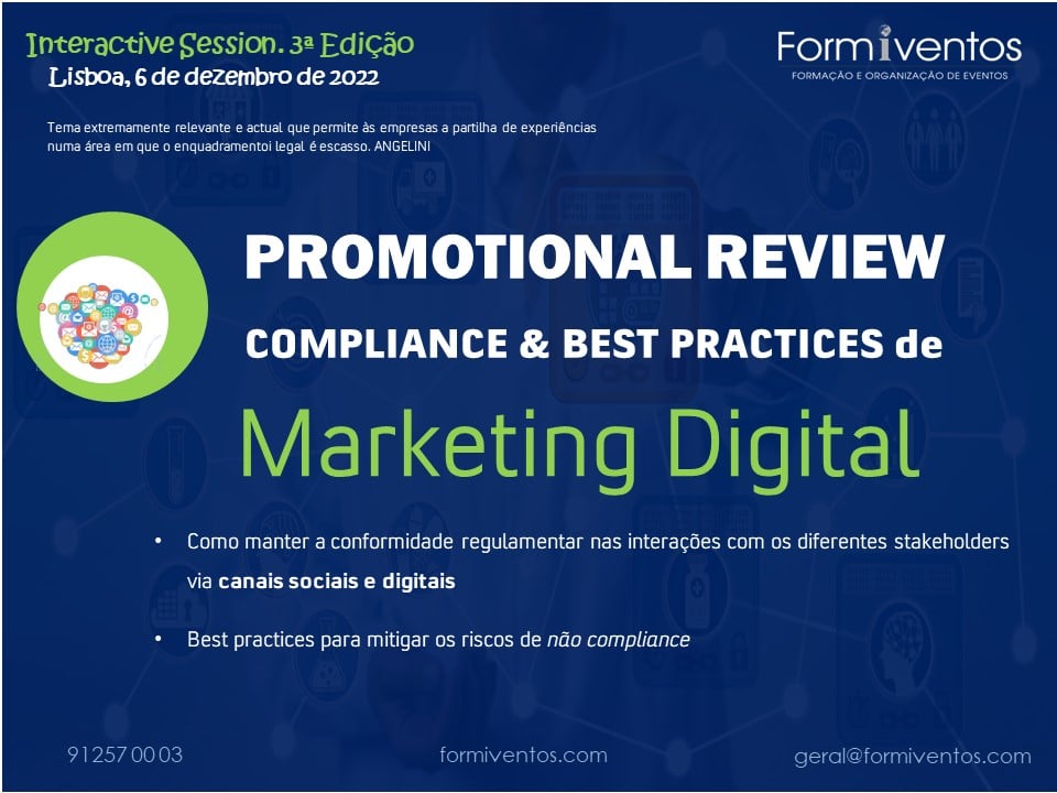 No próximo dia 6 de dezembro, vai decorrer em Lisboa , uma nova edição do workshop prático MARKETING DIGITAL: Promotional Review Compliance, bajo o lema : Como manter a conformidade regulamentar nas comunicações promocionais com os diferentes stakeholders via canais sociais e digitais