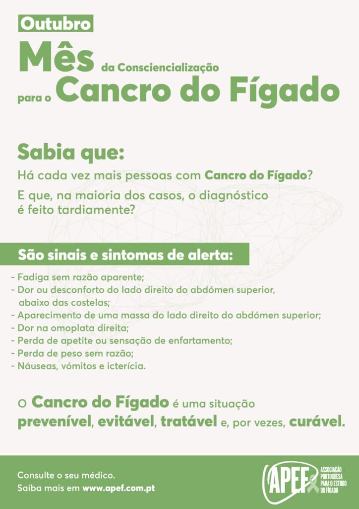 A Associação Portuguesa para o Estudo do Fígado (APEF) pretende alertar a população para a importância de prevenir, detetar e tratar precocemente o cancro do fígado, uma doença cuja frequência é crescente, originando mais de 1300 novos casos por ano, em Portugal, o que corresponde a 2,4 por cento de todos os cancros. Esta comunicação surge no âmbito do Mês da Consciencialização para o Cancro do Fígado, que se assinala em outubro.