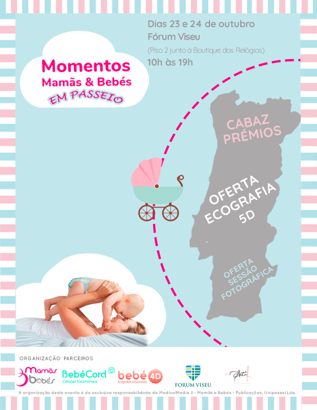 Viseu será palco do próximo evento presencial e gratuito da Mamãs e Bebés. Nos dias 23 e 24 de outubro, entre as 10h00 e as 19h00, no piso 2 do Fórum Viseu junto à Boutique dos Relógios, todas as grávidas que queiram participar no “Momento Mamãs e Bebés em Passeio” terão a oportunidade de experienciar momentos únicos e receber uma série de ofertas.